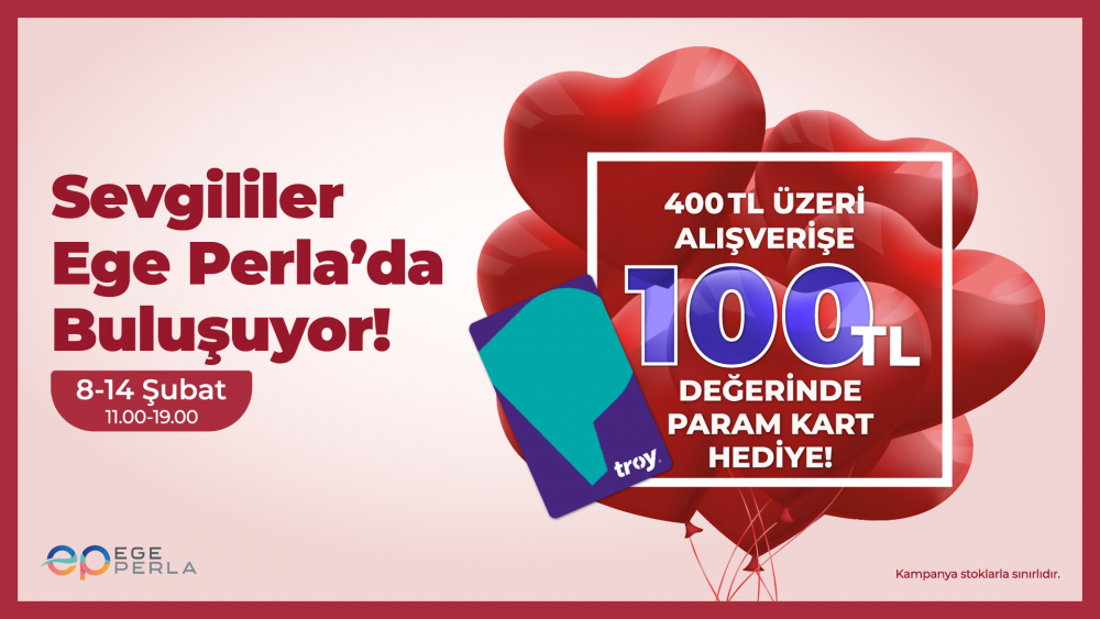 Keyifli ve kazandıran alışverişin tadını her an doyasıya çıkarmak isteyenler; 8-14 Şubat tarihlerinde Ege Perla’da yapacakları 400 TL ve üzeri alışverişe anında 100 lira değerinde Param kart kazanacak. Ziyaretçiler, 100 TL yüklü Param kartı, yine Ege Perla’da bulunan seçili markalarda harcayabilecek.