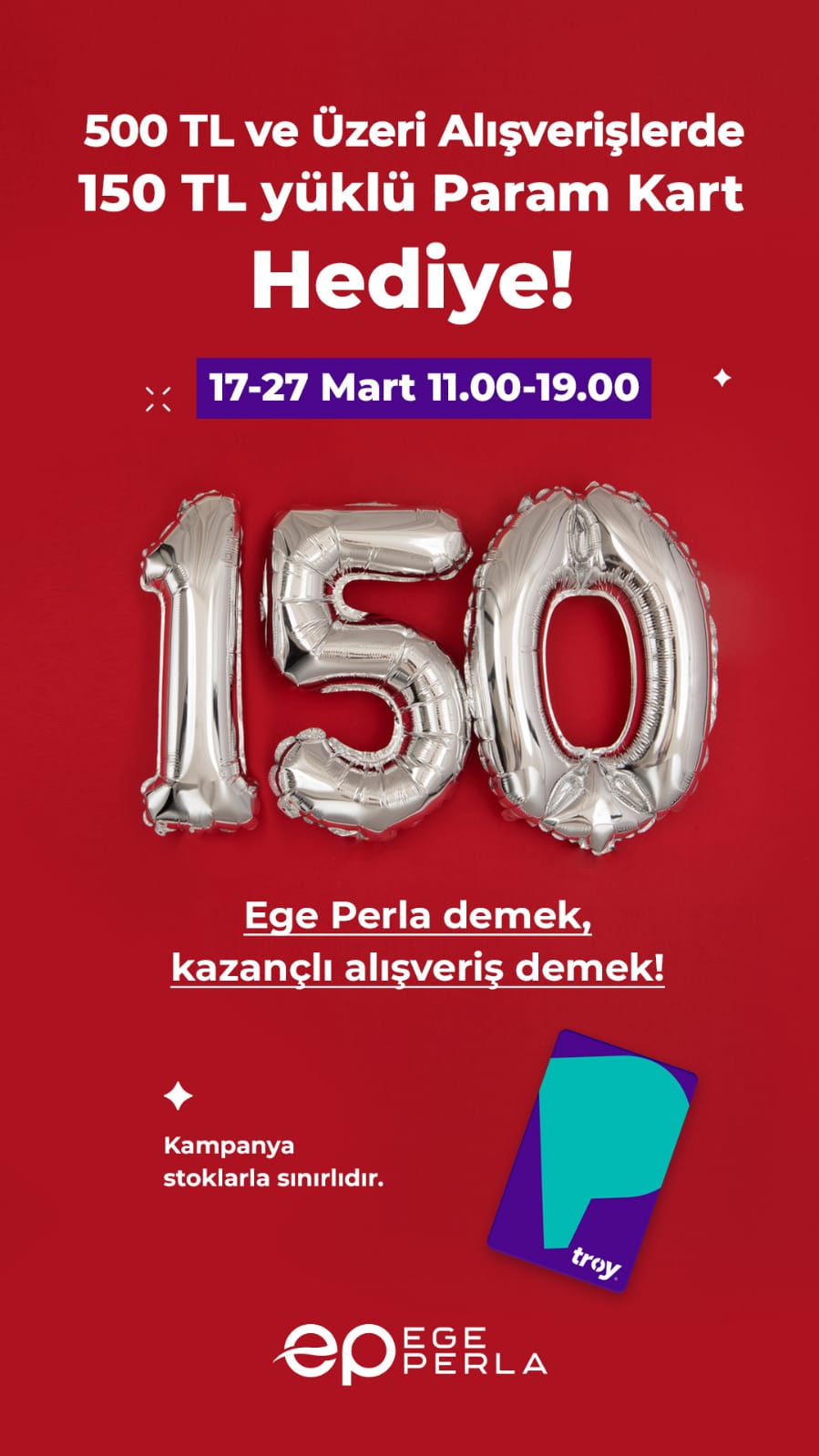 17-27 Mart tarihleri arasında Ege Perla mağazalarından yapacağınız 500 TL ve üzeri alışverişlerde 150 TL yüklü Param kart kazanma fırsatı devam ediyor. Ziyaretçiler, Ege Perla’daki seçili mağazalarda kullanabilecekleri kartlar ile harcarken kazanıyor.