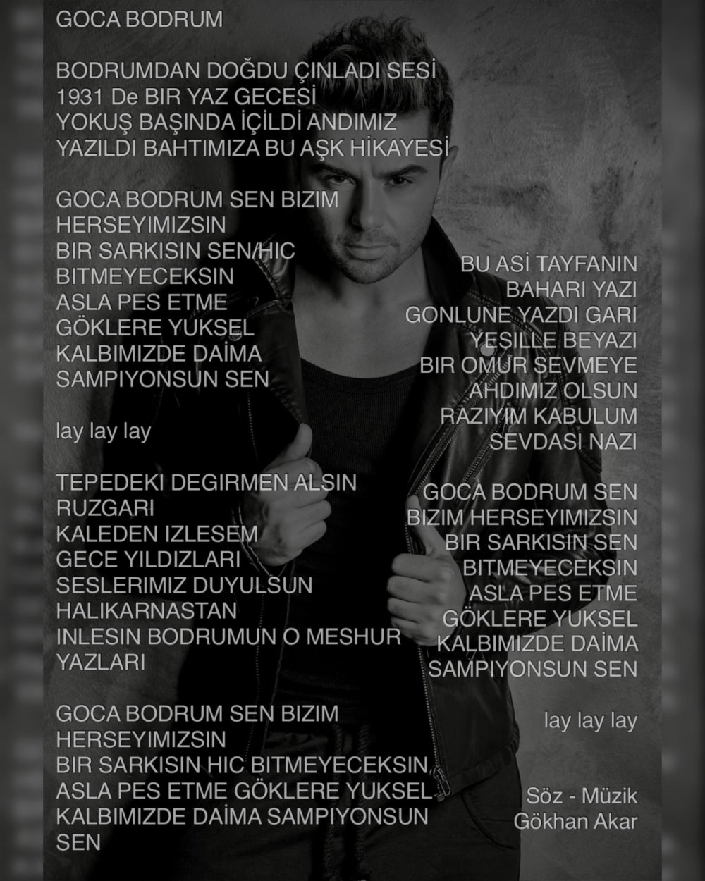 Bodrum’da kutlamalar devam ederken binlerce kişinin katıldığı ve şarkıcı Murat Dalkılıç’ın da sahne aldığı gecede sahneye çıkan sanatçı Gökhan Akar, birgün önce yazdığı o marşı ilk defa sahnede binlerce Bodrumlu ile hep bir ağızdan söyledi. Genç sanatçı Gökhan Akar, sosyal medya hesabı üzerinden de Bodrumspor’a ithafen sözlerini ve müziğini yazdığı ”Goca Bodrum” isimli marşı sevenleri ile paylaştı ve altına: ”Şampiyon Bodrumspor’a hediyem olsun” notunu düştü.