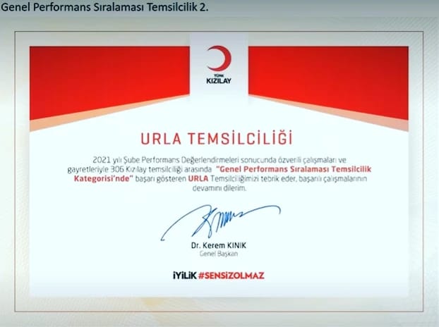2021 yılı şube performans değerlendirmeleri sonucunda özverili çalışmaları ve gayretleri ile Türk Kızılay Urla Temsilciliği, 'Genel Performans Sıralaması Temsilcilik Kategorisi'nde' Türkiye ikincisi oldu.