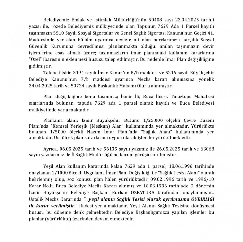 Sinat açıklamasında, 1996 yılında dönemin İzmir Büyükşehir Belediye Meclisi’nde oybirliğiyle alınan ve dönemin başkanı tarafından onaylanan kararı kamuoyu ile paylaştı. Paylaşılan meclis kararında söz konusu alanın “sağlık tesisi” olarak kullanılmasına onay verildiği açıkça belirtiliyor.