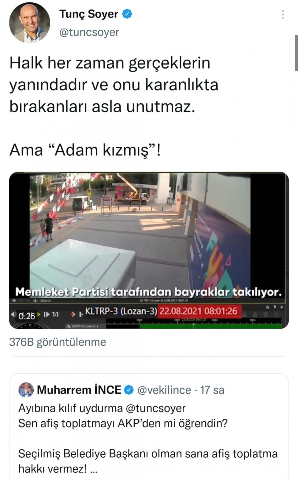 Memleket Partisi Genel Başkanı Muharrem İnce, “Kimsin sen de benim afişlerimi söküyorsun” diyerek Tunç Soyer’e yüklenmişti.