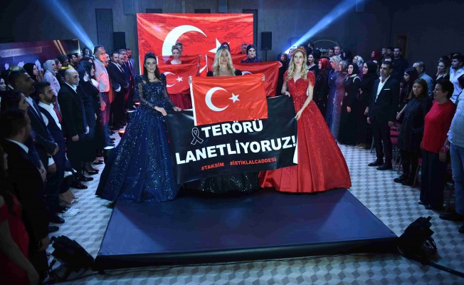 Asr-ı Nazende defilesinde podyuma çıkan Wilma Elles, Tuğba Özay ve Duygu Çakmak, podyumda"Terörü Lanetliyoruz" yazılı pankart açtı...