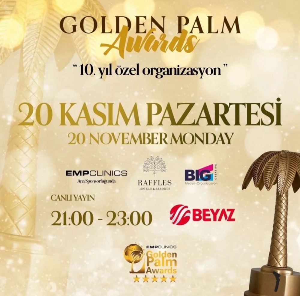 Golden Palm Mag tarafından düzenlenen 10. EMPCLINICS Golden Palm Awards, 20 Kasım 2023 Pazartesi günü Zorlu Center Raffles Hotel’de gerçekleşecek.