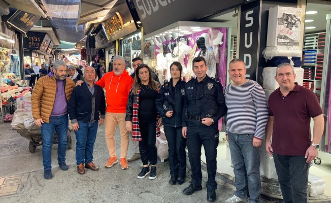 Başkomiser Sefer Güngör' e esnaf ziyareti sırasında, Kemeraltının annesi olarak bilinen 38 yıllık esnaf Şefika Yakut’ta eşlik etti.