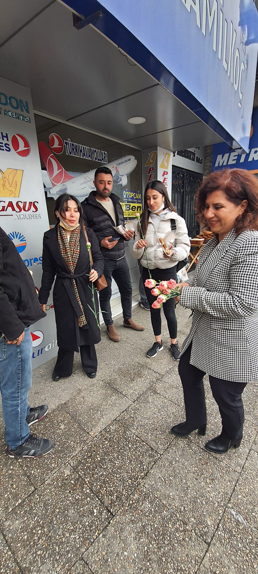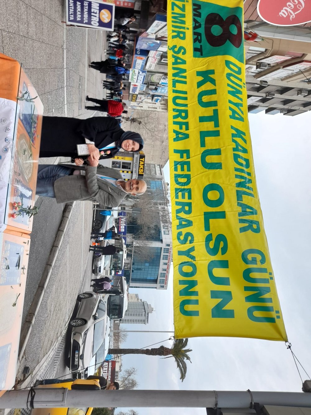 Etkinlikte konuşma yapan İzmir Şanlıurfa Federasyonu Kadın Kolları Başkanı Zuhal Ersöz, “Toplumun en önemli yapıtaşı olan, hayatımızın her anını daha özel kılarak güzelleştiren tüm kadınlarımızın kadınlar gününü kutluyoruz. Siyaset, ekonomi, eğitim, bilim ve kültür olmak üzere her alanda kadınlarımızın sayısının daha da artmasını ümit ediyoruz. Tüm dünyada kadına şiddetin son bulmasını diliyoruz. Şiddet eğilimli düşüncelerin ve ayrımcılığın son bulmasını istiyoruz” şeklinde konuştu. Konuşmaların ardından meydandaki kadınlara çiçek dağıtıldı.